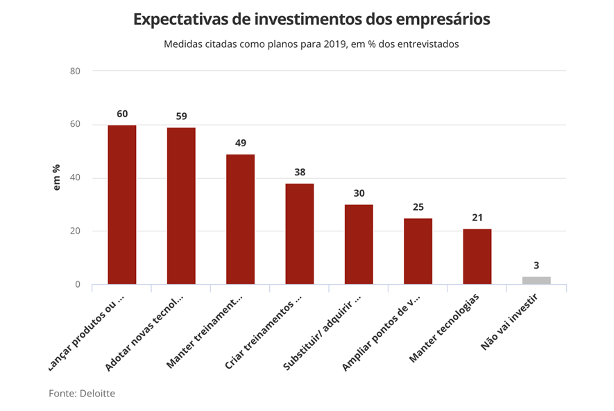 Os empresários estão otimistas em relação à economia e seus negócios em 2019 e, neste cenário, a grande maioria diz que pretende investir no ano que vem. É o que aponta pesquisa feita pela Deloitte divulgada ao G1 ontem, 12/11. Contratar mais funcionários está nos planos de 47% dos entrevistados, enquanto 32% pretendem manter o quadro atual. Apenas 7% esperam demitir.