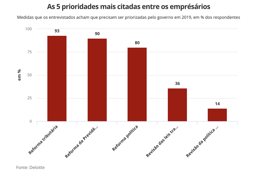Essas mudanças esperadas pelos empresários e mencionadas por Almeida também foram mapeadas pela pesquisa. A reforma tributária deve ser tratada como uma das prioridades para 93% dos entrevistados e a da Previdência, para 90%.