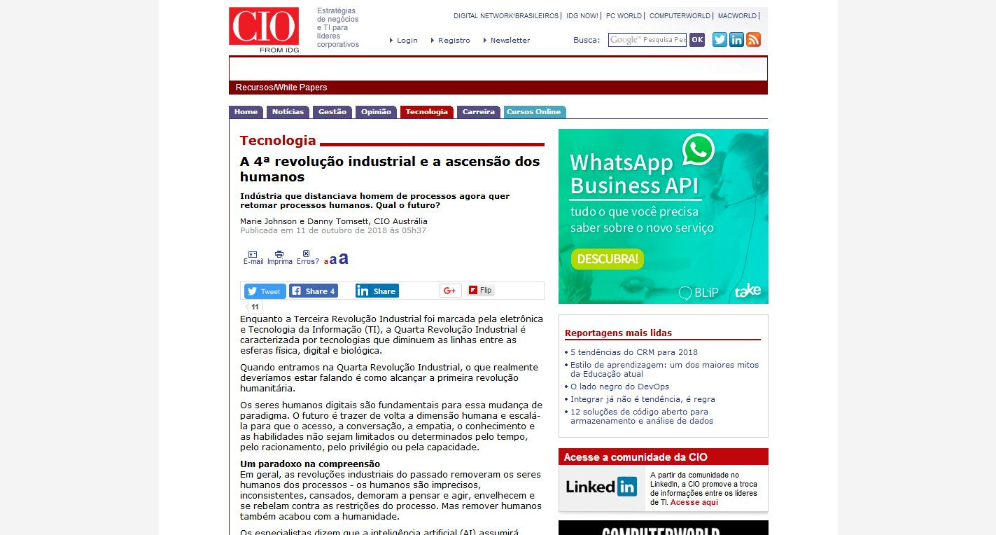 Link: http://cio.com.br/tecnologia/2018/10/11/a-4a-revolucao-industrial-e-a-ascensao-dos-humanos/