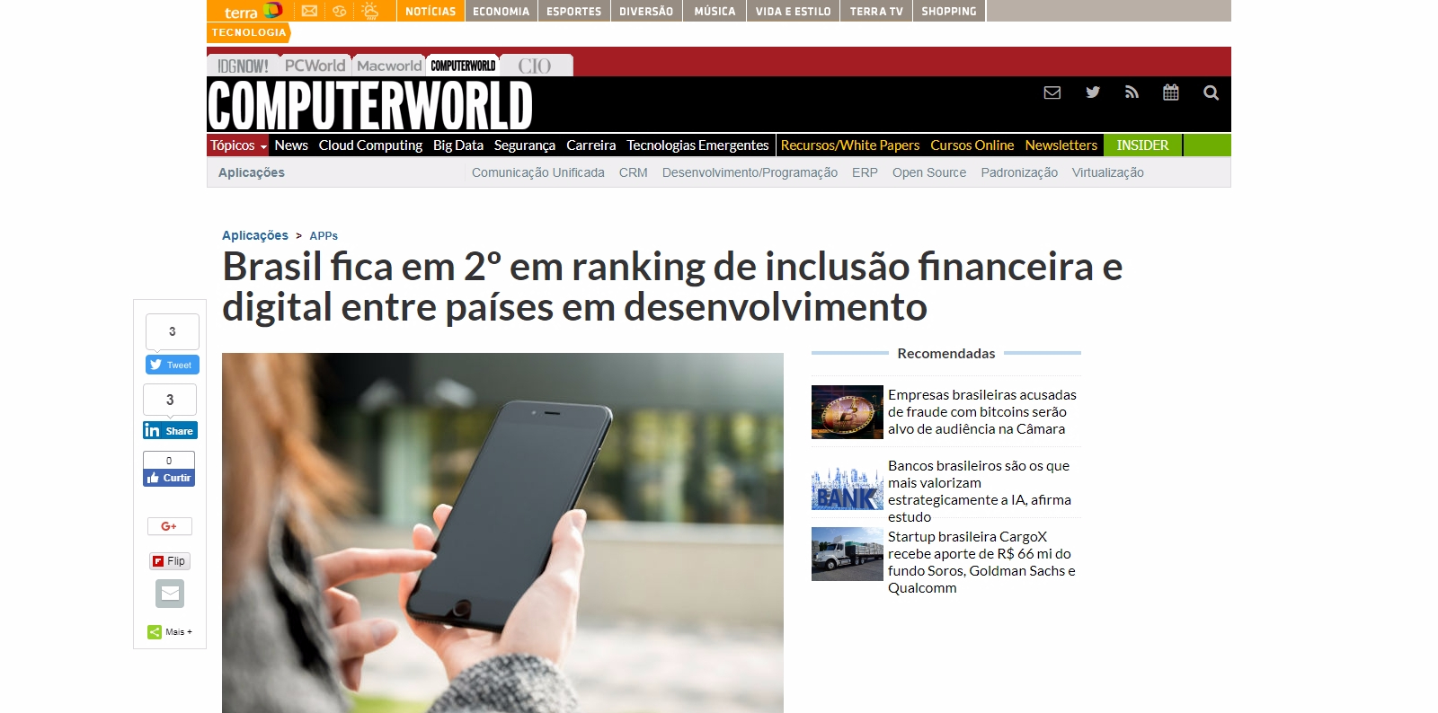 Link: http://computerworld.com.br/brasil-fica-em-2o-em-ranking-de-inclusao-financeira-e-digital-entre-paises-em-desenvolvimento