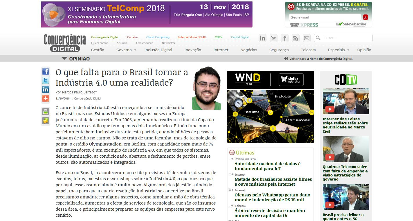 Em artigo publicado no Portal Convergência, Marcos Paulo Barreto, arquiteto de software da Stone Age, aborda o conceito da Indústria 4.0 e faz uma reflexão sobre o que falta para que ela seja uma realidade no Brasil. Segundo o autor, alguns projetos já estão saindo do papel, mas para que a quarta revolução industrial se concretize no Brasil, precisamos amadurecer alguns aspectos, como ampliar a mão de obra técnica especializada, aumentar a oferta de serviços de tecnologia, que são os insumos dessa área, e principalmente preparar as equipes das empresas para este novo cenário.